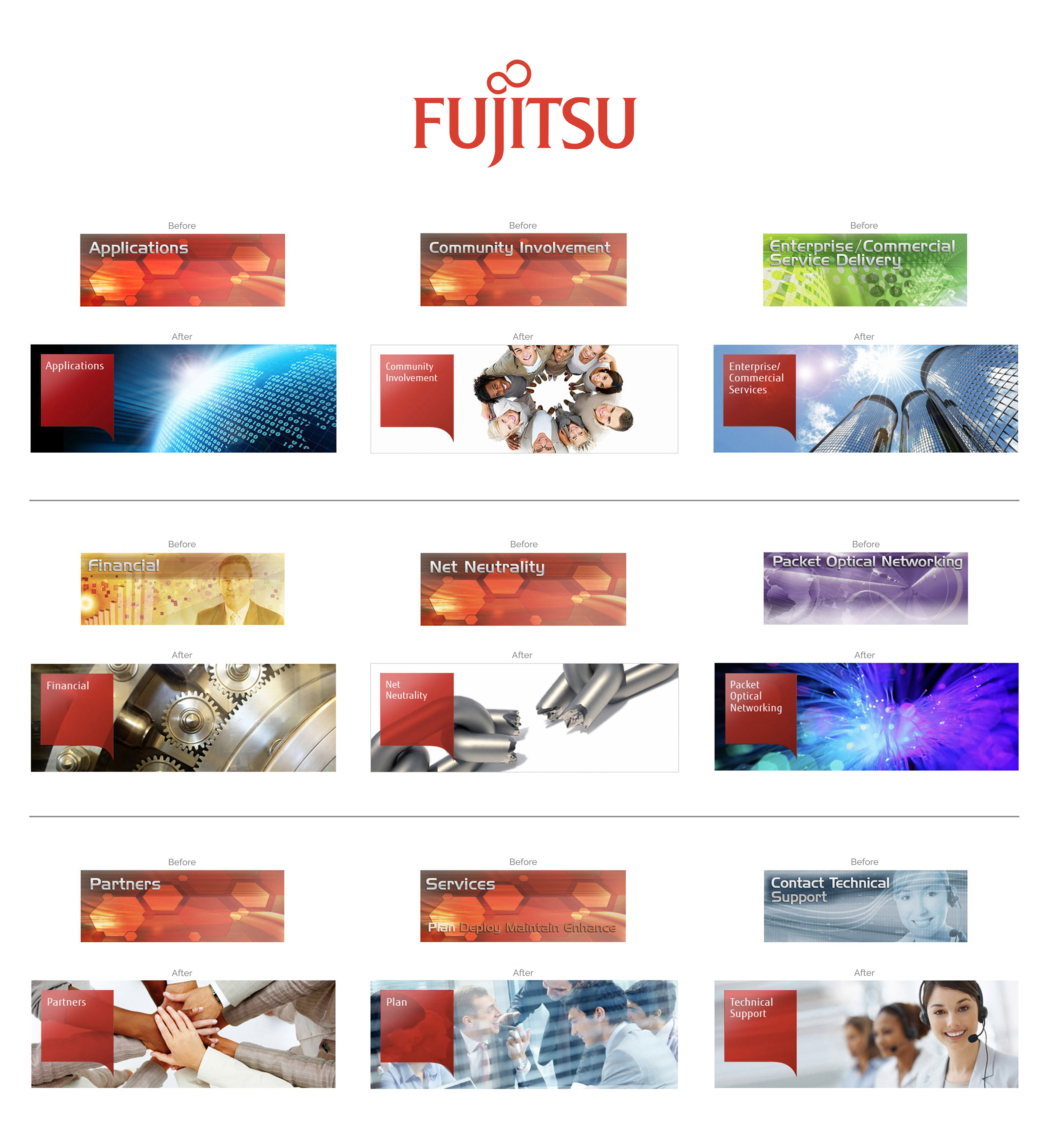 I was contracted to upgrade product web banners for Fujitsu Networks USA. Several before-and-after samples are seen on this page. Also shown are high-level social media pieces for KPMG.